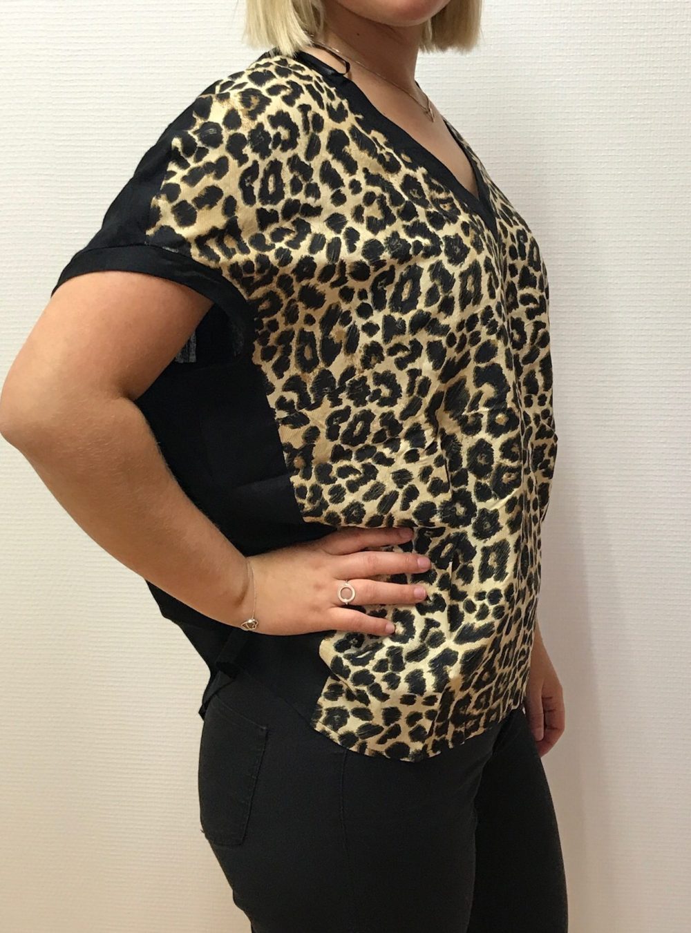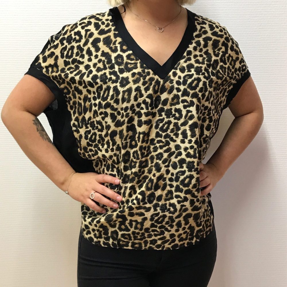 Stilfuld V-halset top med en solid ryg og kølig leoprintfront. Lige i bunden og let afrundet på bagsiden. Toppen er fri i pasformen. Køb unikt tøj til hverdag og fest hos Ladies Fashion. Gratis fragt ved køb over 500!