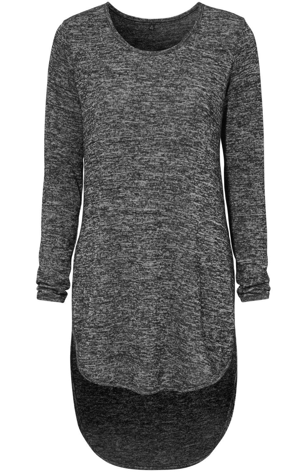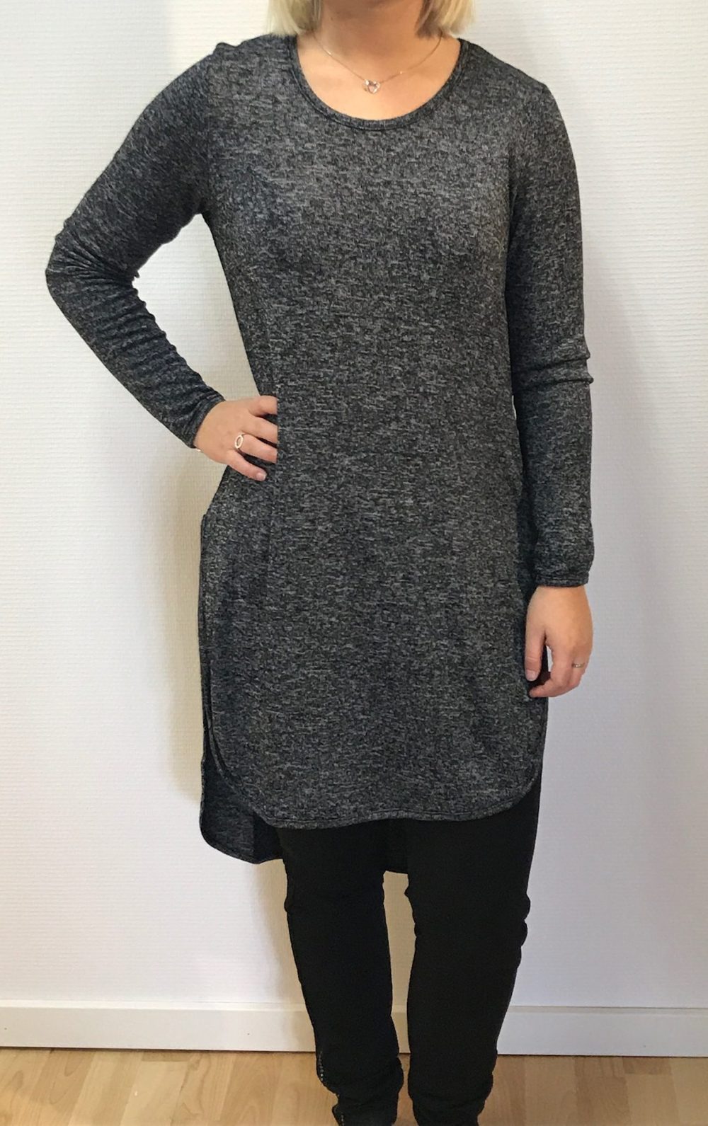 | Beskrivelse | Langærmet tunika med afrundet nederkant og ryg og slidser i siderne. Stilfuld sort melange farve! Fri pasform |