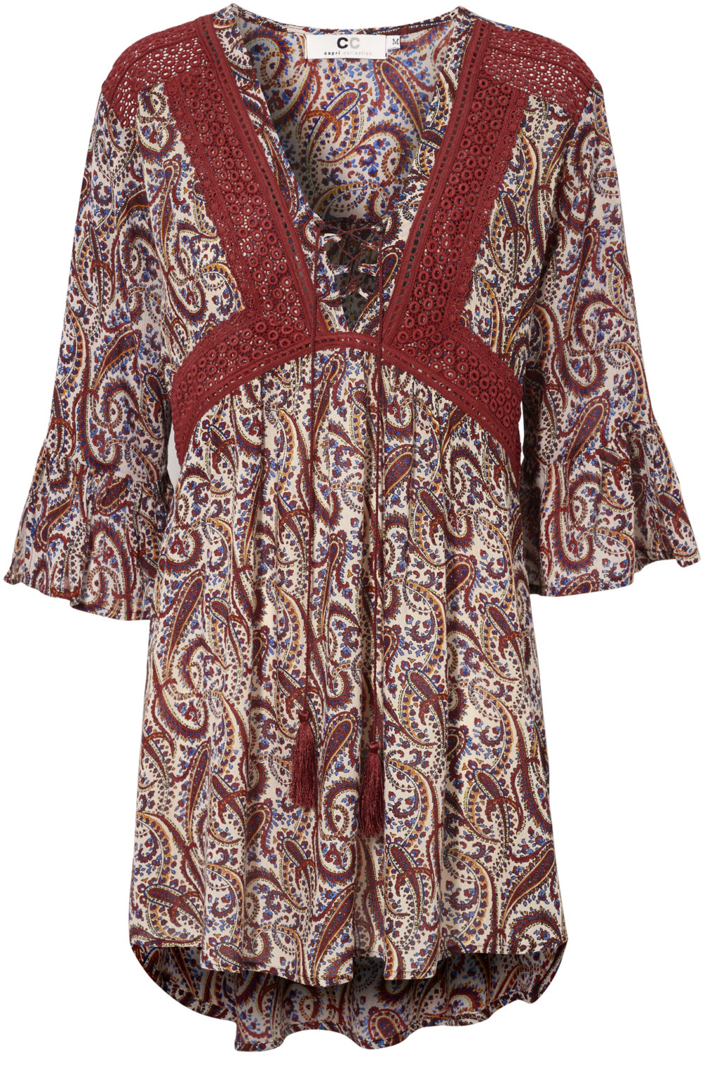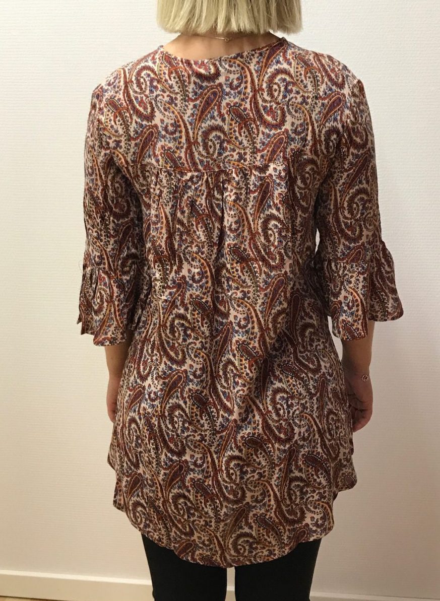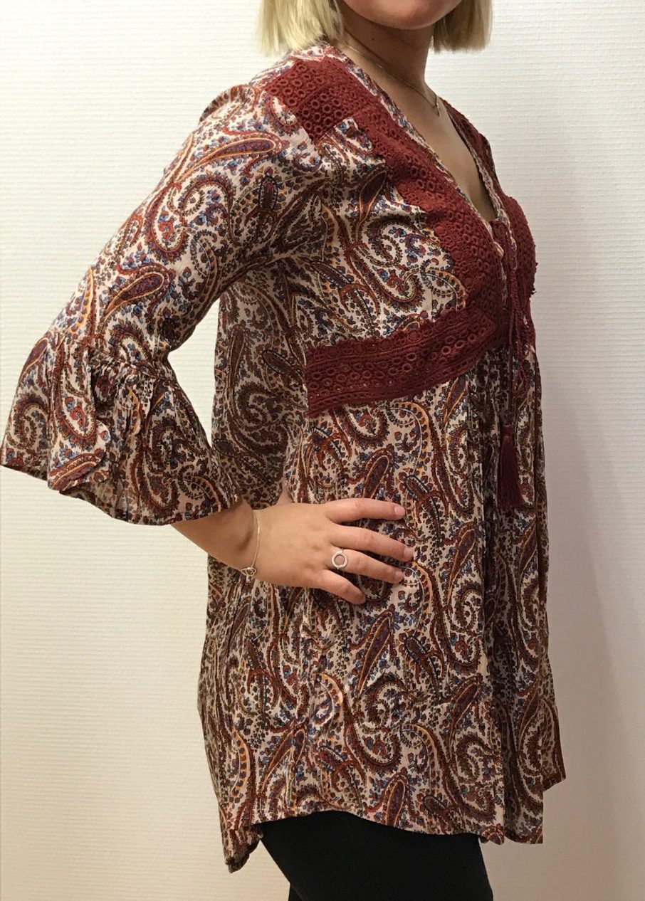 Vi elsker mønstre! Nice opfølgning på den store sælger Gia Tunika, i et smukt paisley mønster i flotte farver! Fri pasform med let snit lige under brystet. Fuldlange ærmer, smuk blonder foran og flot slips i halsen.