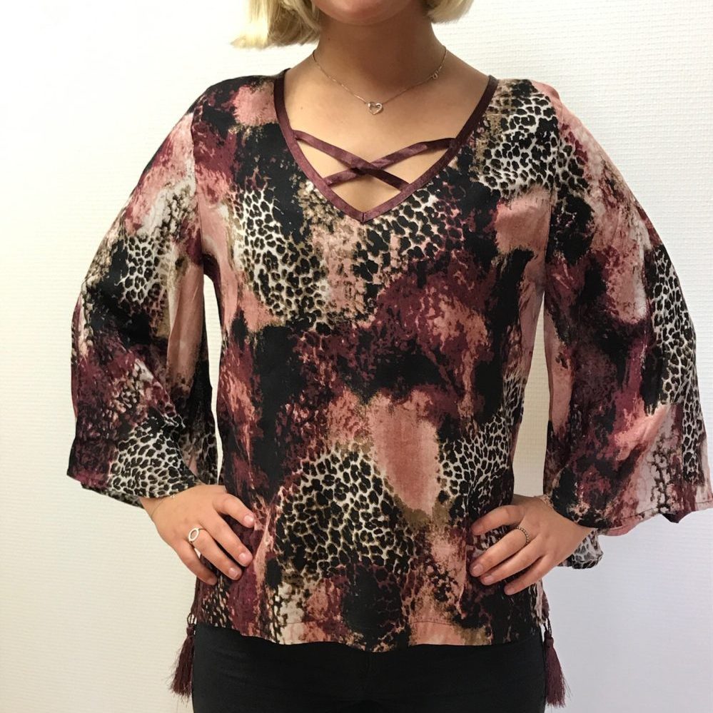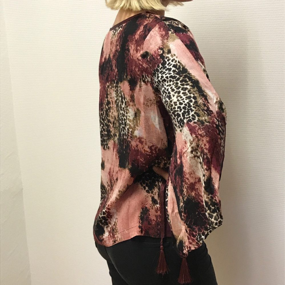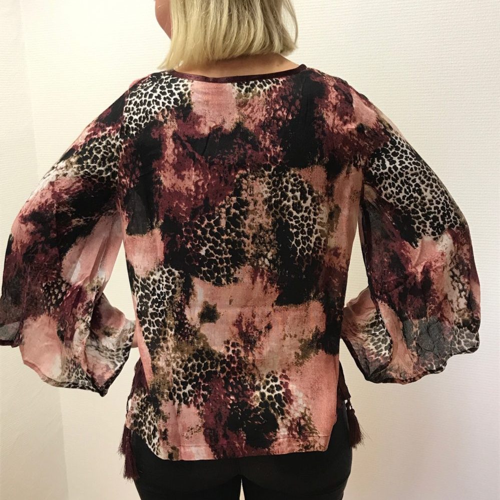 | Beskrivelse | Smuk mønstret tunika i den trendy farvekombination Ruby / Rose. Modellen har en yderligere ærme og har også en spalte i sidesømmen |