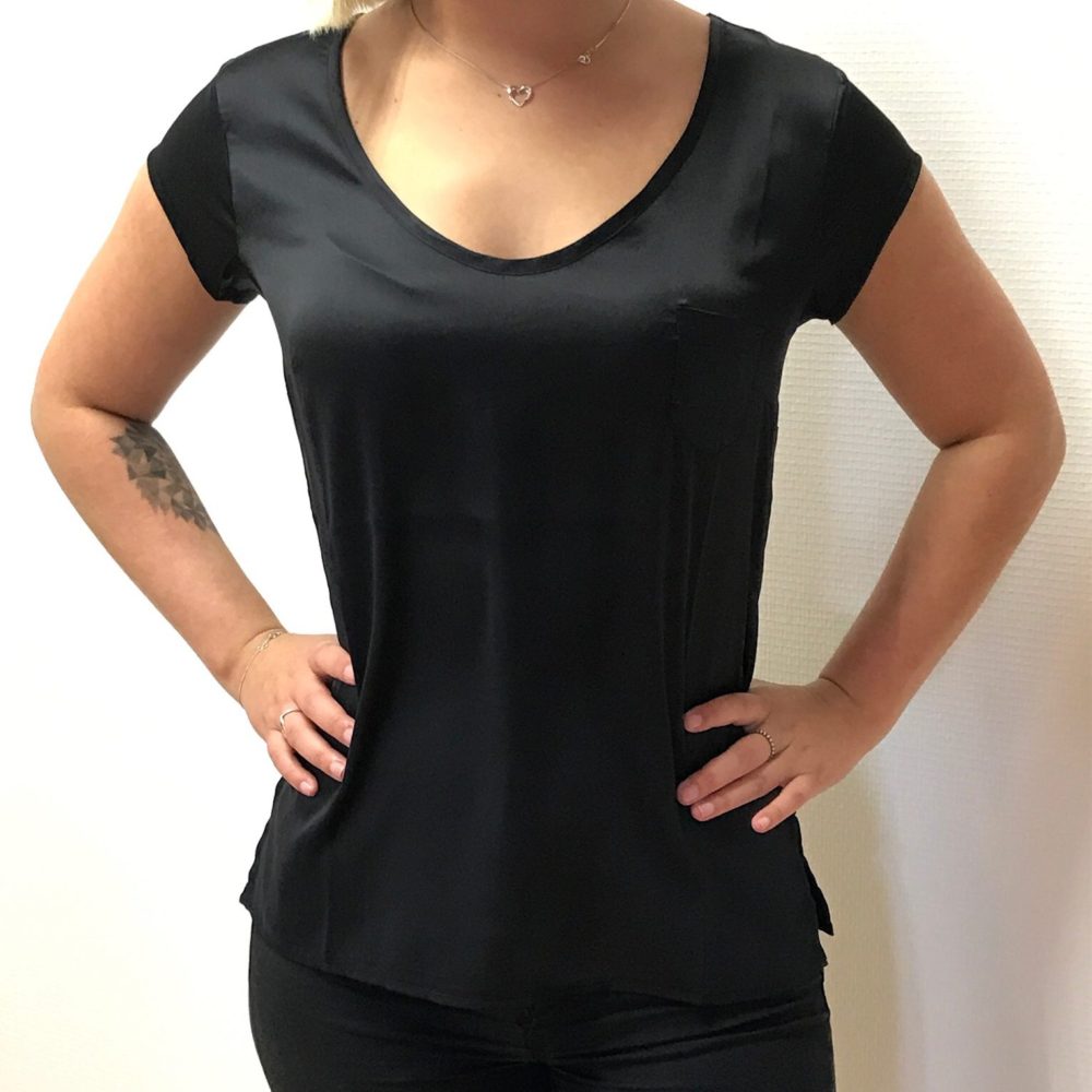 | Beskrivelse | Sød v-halset top i satin med dejlig glans. Lige så velegnet til hverdag og fest. Lille brystlomme på venstre side og smuk ærme. Korte slidser i siderne. Findes også i Sand Pearl. |