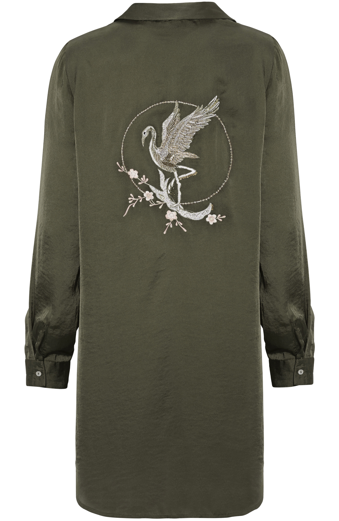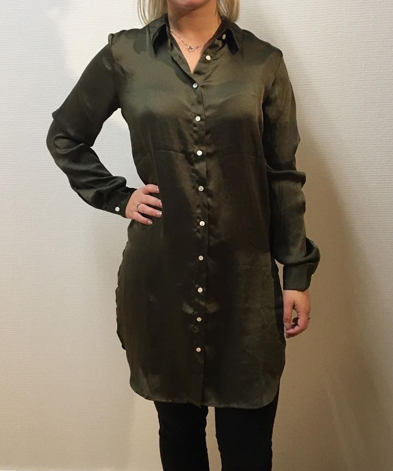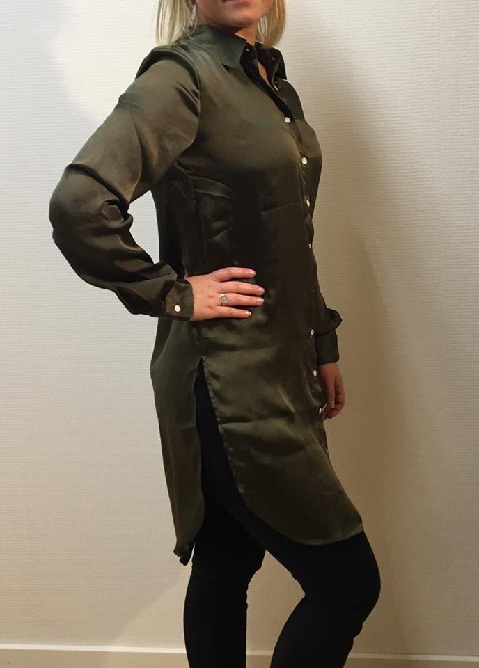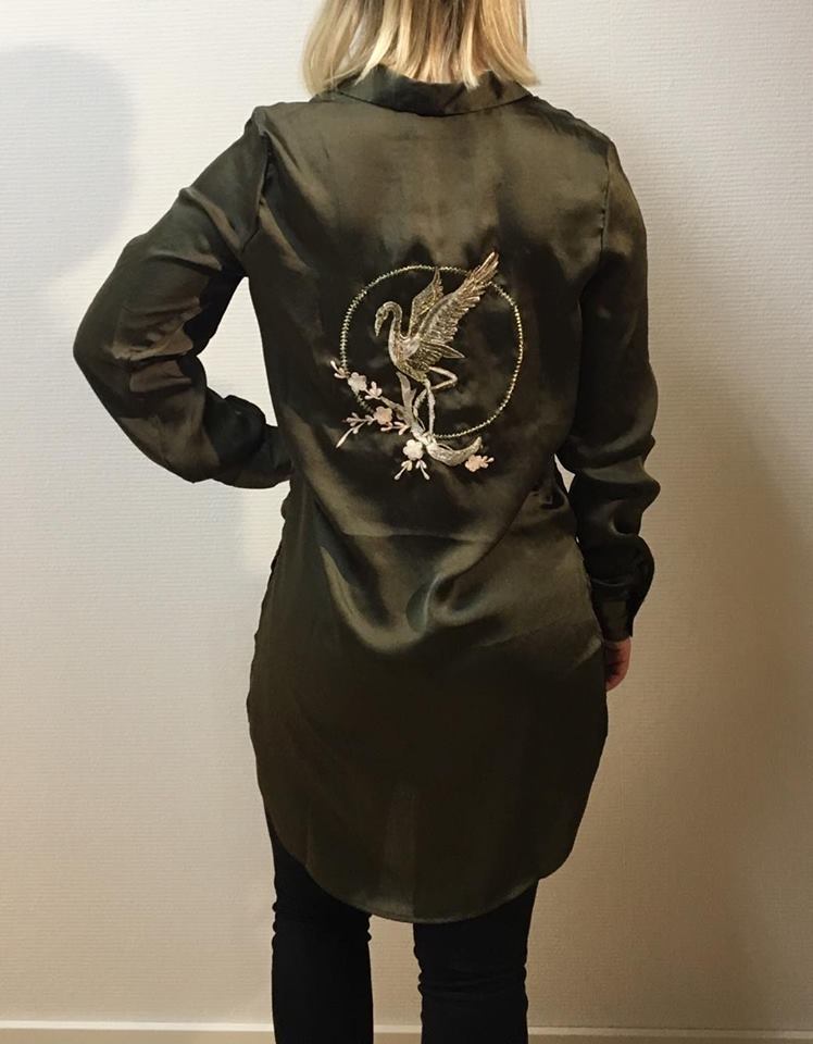 | Beskrivelse | Smuk lang skjorte i skinnende satin med høj glans. Fin detalje på ryggen med både broderi og pailletter. Slids i siderne og med knapper foran |