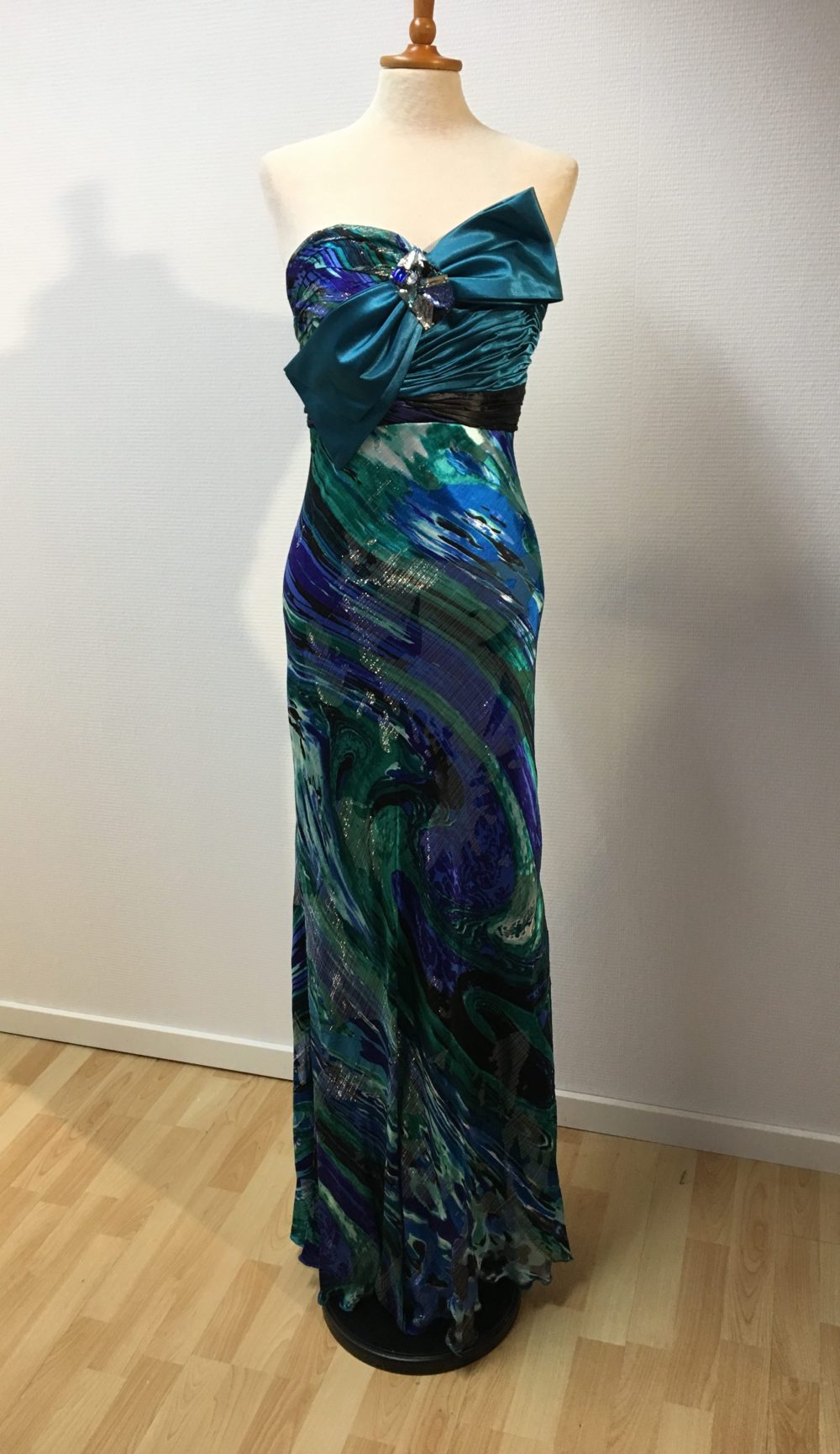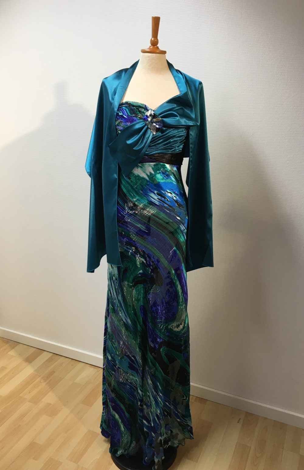 | Beskrivelse | Gallakjole med sløjfe og sjal Str : Man siger et nr større end det man plejer at bruge, da det er fra Paris |