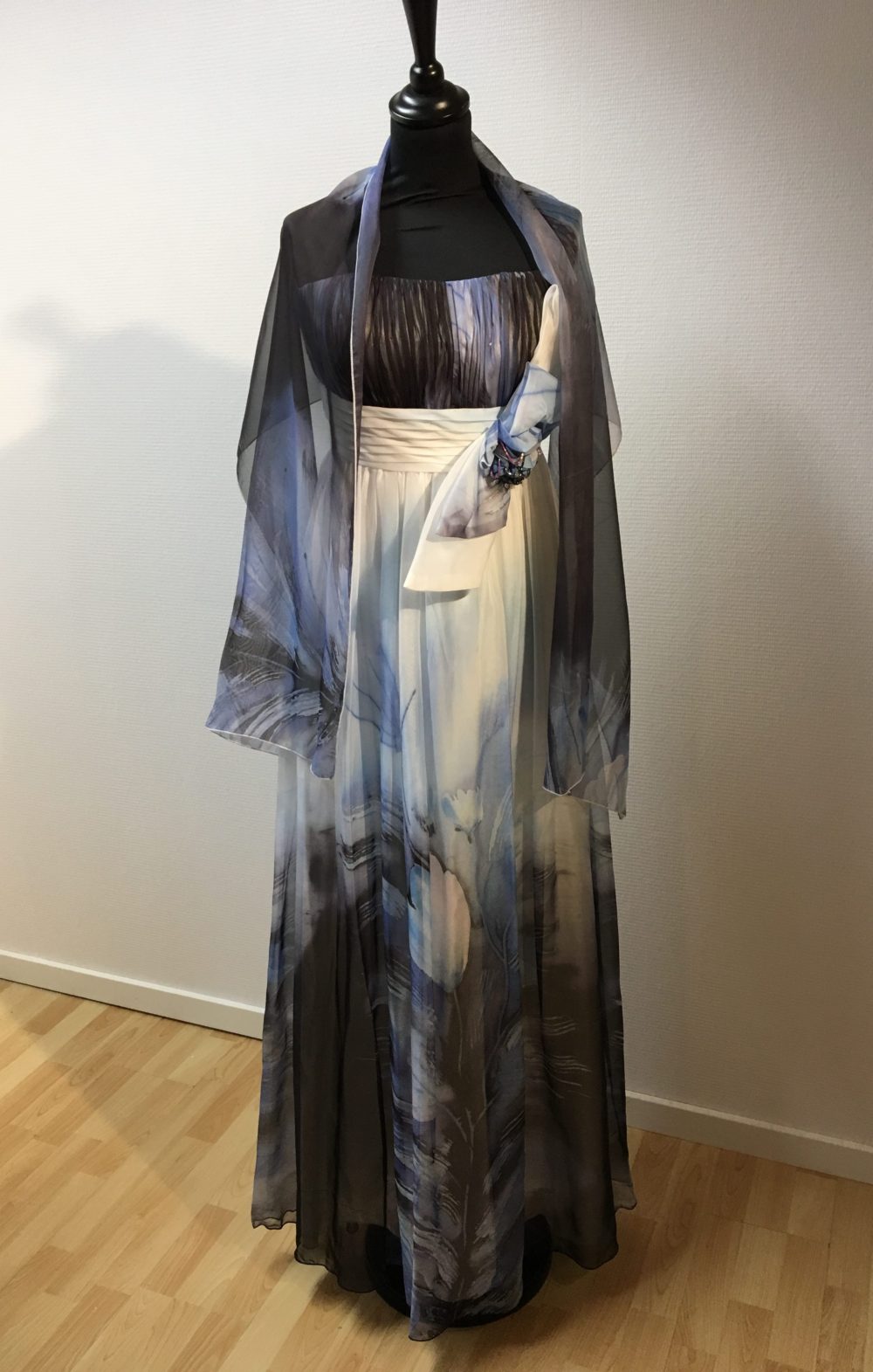 Fin gallakjole og sjal i Blå/Hvid. Man plejer at gå en størrelse op, da det er kjoler fra Paris. Køb unikt tøj til hverdag og fest hos Ladies Fashion. Gratis fragt ved køb over 500!