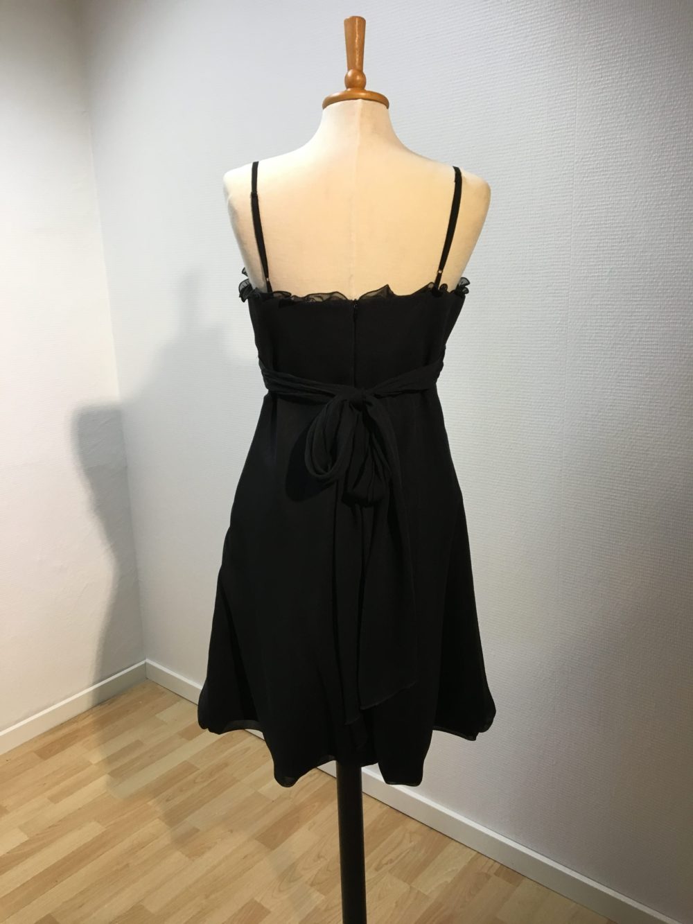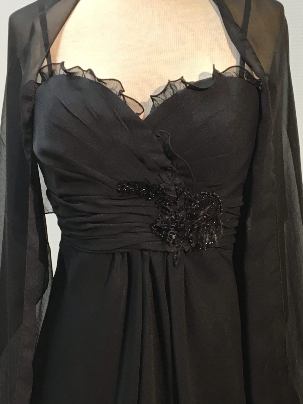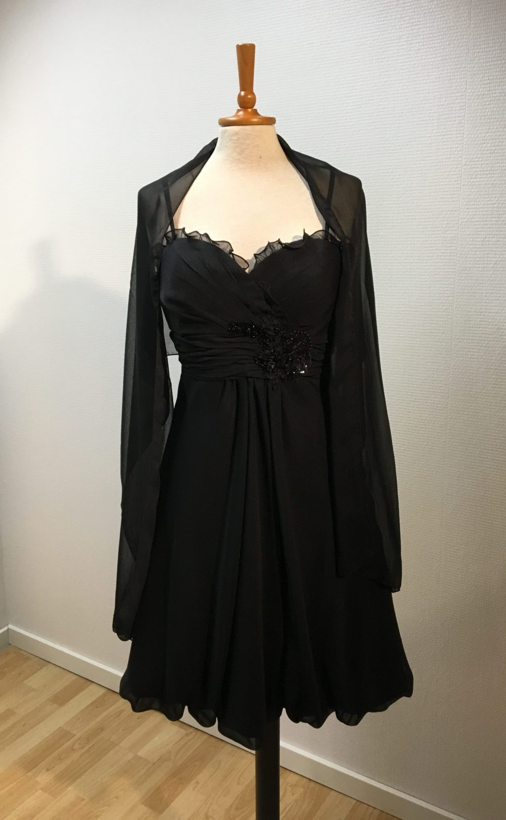 | Beskrivelse | Kort gallakjole med palietter i en blomst på maven og et sjal Str : Man siger et nr større end det man plejer at bruge, da det er fra Paris |